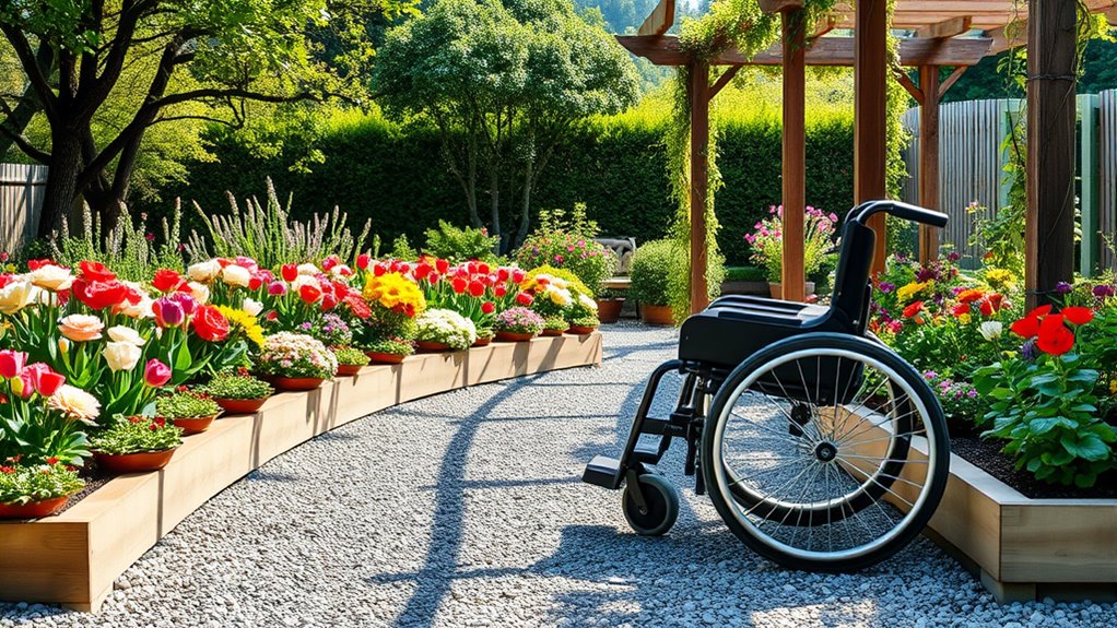 Creating a wheelchair-friendly garden guarantees you can enjoy the beauty of your outdoor space comfortably and independently. The foundation of this design starts with ensuring you can move easily throughout the garden without barriers. Accessible pathways are essential; they should be wide enough—at least 36 inches—to allow your wheelchair to navigate smoothly in all directions. Use smooth, firm surfaces like concrete, compacted gravel, or pavers that provide stability and reduce the risk of slipping or getting stuck. Keep the pathways clear of obstructions such as garden tools, hoses, or decorative stones to prevent accidents. Incorporate gentle curves rather than sharp turns to make navigation more effortless and visually appealing. Properly positioned pathways connect all key areas, including seating spots, water features, and planting zones, creating a seamless flow that encourages exploration without frustration.