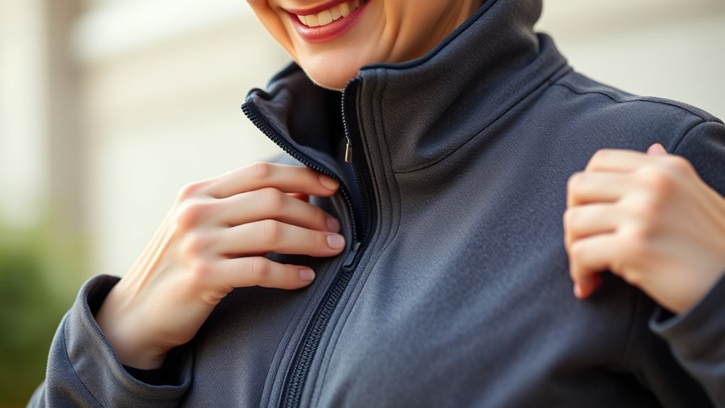 Think of adaptive clothing as your canvas for elegance. To style it for formal occasions, start with classic pieces like tailored blouses or trousers. Use accessorizing tips such as statement jewelry or sleek shoes to elevate the look. Focus on color coordination by pairing neutral tones with bold accents. This approach creates a polished, sophisticated appearance, letting your adaptive wardrobe seamlessly blend comfort with refined style.