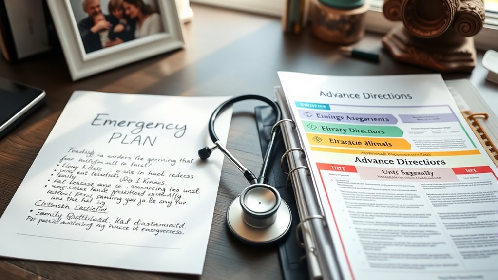 If your emergency situation differs from your directives, remember that most advance directives include provisions for alternative scenarios, allowing some flexibility. You should communicate your wishes clearly and update your directives regularly to reflect potential changes. In emergencies, healthcare providers will review your directives and interpret them based on the current situation, considering any specified alternative scenarios. This helps guarantee your preferences are respected even if circumstances change unexpectedly.