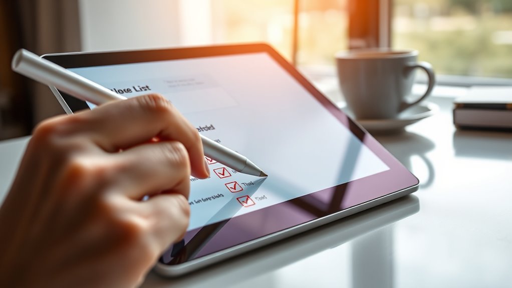 To schedule daily tasks effectively with electronic task lists, start by prioritizing your most critical activities in the morning when you’re alert. Use digital tools like Google Calendar or Todoist to set reminders, alerts, and deadlines, keeping you organized and focused. Easily reschedule or reorganize tasks as priorities shift, and leverage notifications to stay on track. If you want to learn how to optimize your workflow further, keep exploring strategies that integrate these methods seamlessly.