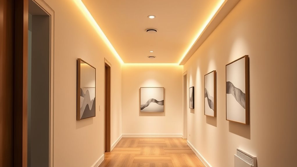 Think of motion-sensor lights as the silent guardians patrolling your hallways, always ready to illuminate your path when needed. Like a lighthouse guiding ships through darkness, they guarantee safety without fuss. By installing them, you create a seamless dance of light and shadow, where every step is met with gentle guidance. Embrace this upgrade as a quiet sentinel, turning your hallway into a well-orchestrated symphony of convenience and security.