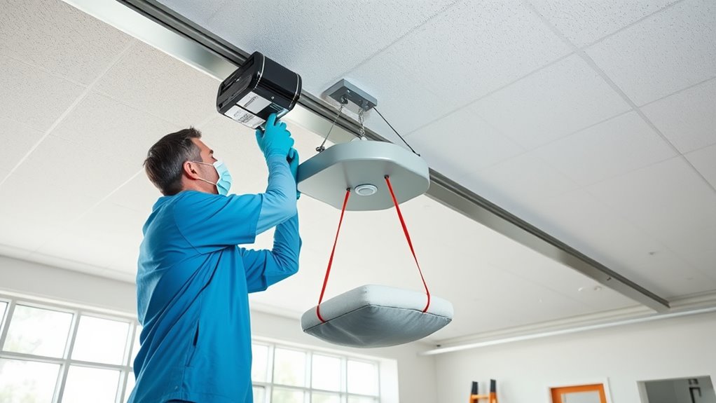 To install a ceiling lift, choose a location that supports safe transfers, guaranteeing the ceiling can handle the lift’s weight. Securely mount the ceiling track to strong support beams, and verify electrical connections and safety features like emergency stops. Regular maintenance and proper training for caregivers are essential for safe operation. Following these steps helps ensure reliable, safe use, but exploring the detailed process will help you get everything installed correctly and confidently.