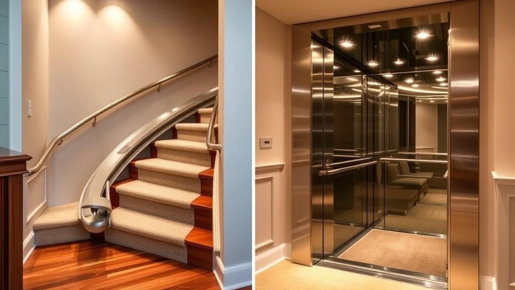 When choosing between a stair lift and a home elevator, consider safety features, costs, and space. Stair lifts are more affordable, easier to install, and need less space, making them ideal for most staircases. Elevators offer full access, safety doors, and smoother rides but require more space and higher investment. Both can integrate with security systems to guarantee safety. To make the best choice for your home, explore detailed differences ahead.
