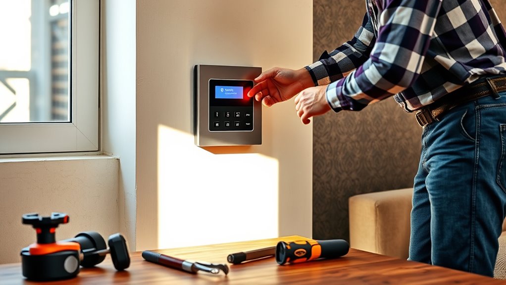 To install an emergency alert system in your home, choose a reliable, user-friendly device with battery backup to stay functional during power outages. Follow the manufacturer’s instructions carefully, ensuring the system integrates smoothly with your existing safety protocols. Set up multiple notification channels like sirens, texts, or apps to guarantee everyone stays informed in emergencies. Proper installation and testing are key—keep going to discover important tips for ensuring your system works flawlessly when needed.