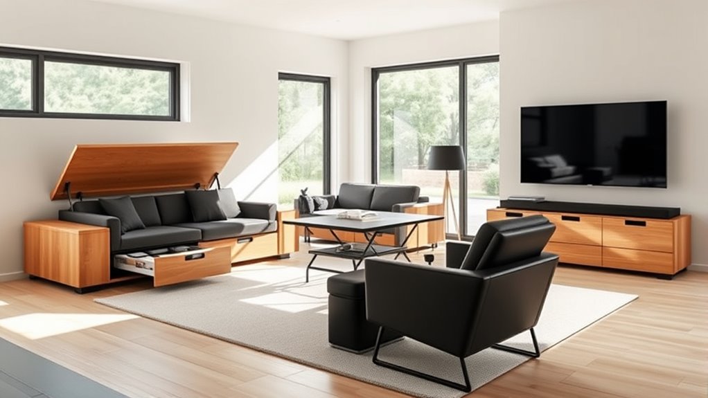 Leveraging modular furniture lets you easily customize your space to fit changing needs and lifestyles. With adaptable components, you can reconfigure layouts for work, relaxation, or entertaining without hassle. Space-saving designs help you maximize small areas and keep clutter at bay. Plus, integrating smart technology can make adjustments even simpler. If you want to discover how to boost your environment’s flexibility and style, there’s more to explore on how modular systems revolutionize modern living.