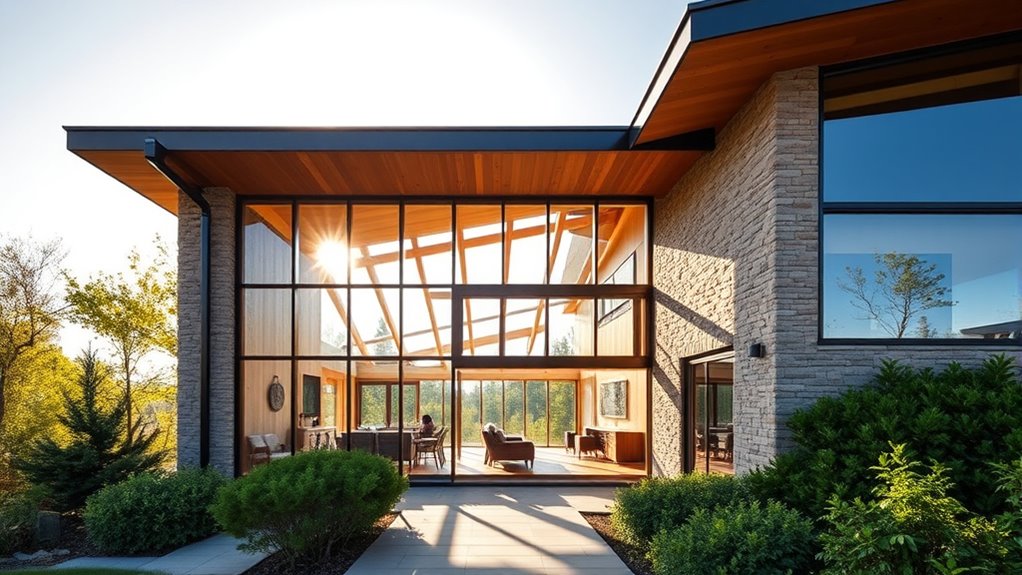 You can save energy with passive solar design by orienting windows toward the south in the northern hemisphere to maximize winter solar gain. Using thermal mass like concrete or brick helps absorb and slowly release heat, maintaining a stable indoor temperature. Overhangs and shading prevent overheating in summer while allowing winter sunlight inside. Combining these strategies creates a comfortable home that reduces heating and cooling needs. Keep exploring to discover more ways to optimize your building for energy efficiency.
