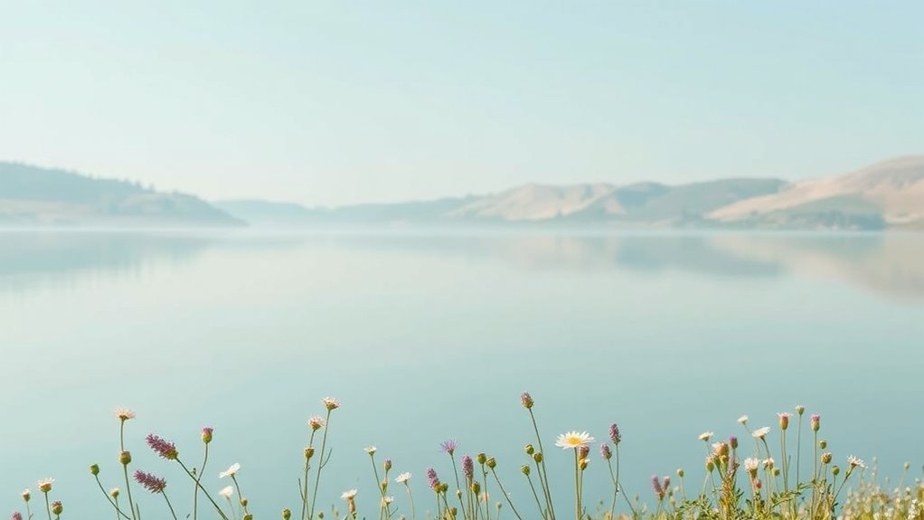 When choosing calming colors inspired by nature, focus on soft greens, gentle blues, and neutral earth tones. These hues promote relaxation, reduce stress, and create a peaceful environment. Use natural-inspired shades with balanced saturation to prevent overstimulation and foster harmony. Incorporate a cohesive palette with harmonious progressions to enhance serenity. If you want to discover how to select the perfect calming hues and make your space truly tranquil, keep exploring these color ideas.