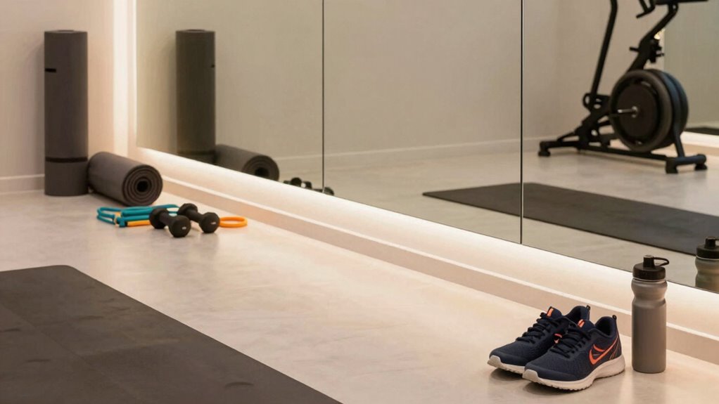 To create an effective workout environment, it’s essential to contemplate both the layout and ambiance of your space. Start with mirror placement; position wall mirrors so you can easily check your form during workouts. Pay attention to lighting considerations—natural light boosts mood, while soft artificial lighting can minimize glare. Organize your space to reduce distractions; keep equipment neatly stored, allowing for multi-purpose usage. Incorporate motivational decor, like inspiring quotes or images, to keep you focused. Enhance technology integration by ensuring your fitness mirror is easily accessible and connected to your devices. Additionally, consider ergonomic principles to optimize comfort and prevent strain during your workouts. Maintaining a clean and well-maintained space can also prevent home cleaning issues that affect your workout environment. Being mindful of indoor air quality can further improve your exercise experience and overall health. Incorporating proper ventilation can help reduce indoor pollutants and allergens, making your space healthier and more inviting. Ensuring good ventilation also supports energy efficiency, which can lower your overall utility costs while maintaining a comfortable environment. By prioritizing these elements, you’ll foster an inviting atmosphere that encourages daily workouts and supports your fitness journey.