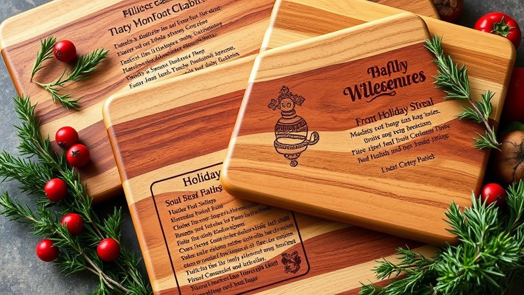 Adding personalized touches to your cutting board transforms it from a simple kitchen tool into a meaningful keepsake. You can choose engraving techniques like laser or hand engraving to add names, dates, or special messages. Color customization lets you select hues that match your holiday decor or personal style, making the board truly unique. Consider the following options: