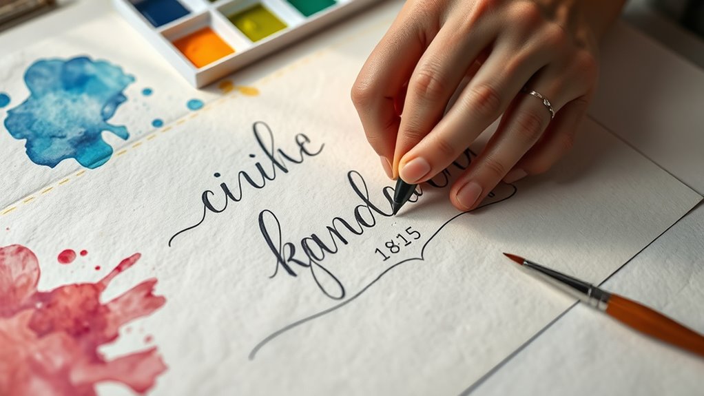 Additionally, understanding privacy and cookie usage can help safeguard your digital creations and personal information during the editing process. You can also use digital tools to add decorative elements, such as borders, floral accents, or background patterns, further personalizing your art print. This combination of calligraphy techniques and digital editing empowers you to transform a simple handwritten letter into a piece of art that’s both meaningful and visually intriguing. Once satisfied with the design, you can print it on high-quality paper or canvas, ensuring durability and vibrancy. Framing your finished piece turns it into a lasting keepsake, perfect for gifting or decorating your space. Overall, blending traditional calligraphy with modern digital editing allows you to preserve personal moments beautifully, transforming them into timeless art prints that truly reflect your style and sentiment.