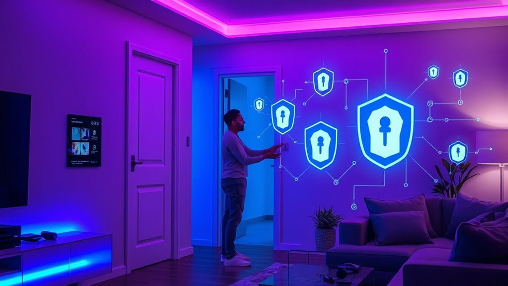 To boost your smart home security, consider isolating your IoT devices from your main network. Creating virtual networks helps prevent potential breaches from spreading, while monitoring network traffic keeps you aware of unusual activity. These steps make it harder for hackers to access your sensitive information or control your devices. Additionally, implementing robust safety measures can further protect your smart home from emerging AI vulnerabilities.