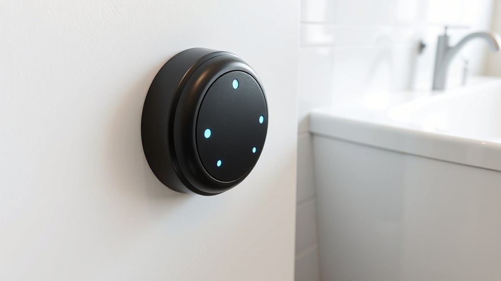 Basement and utility rooms are critical areas where water leaks can cause significant damage and costly repairs. Installing smart leak detectors here helps you catch leaks early, preventing mold growth and structural issues. These rooms often have waterproof flooring, which can contain minor leaks, but large or unnoticed leaks still pose risks. Place detectors near appliances, sump pumps, and drain systems to monitor for any signs of water intrusion. Regular drain maintenance keeps pipes clear and reduces leak chances, but a detector acts as an essential backup. Early detection allows you to address issues before they escalate, saving money and hassle. Incorporating sound healing science principles, such as monitoring for vibrations or irregularities, can further enhance detection accuracy. Protect your renovation investments by strategically installing leak detectors in these high-risk areas.