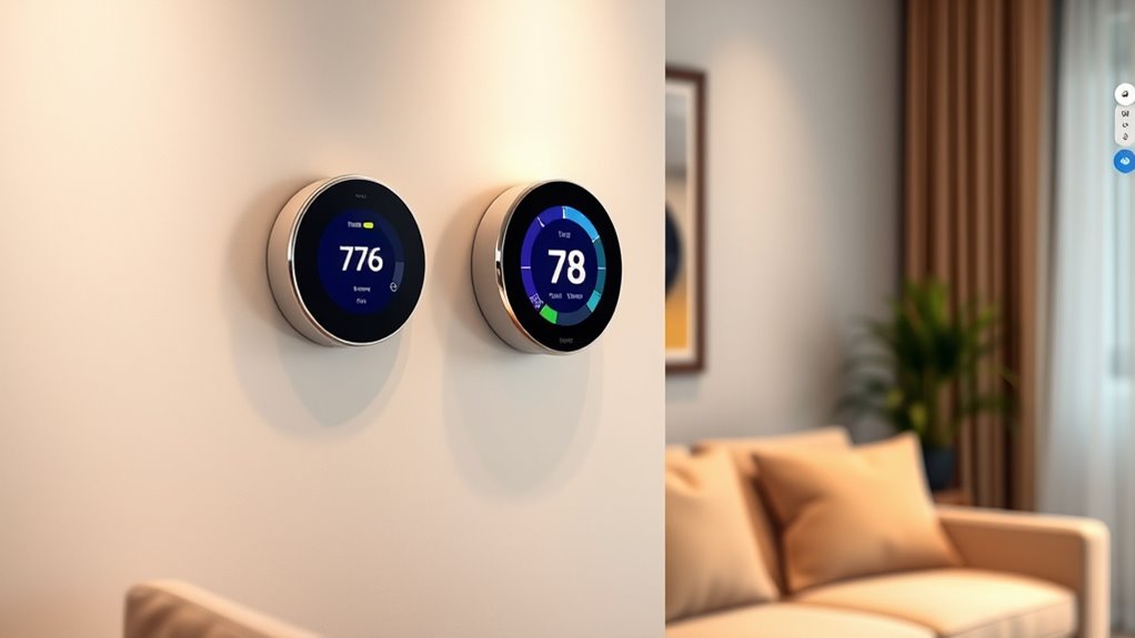 The learning capabilities of smart thermostats are designed to adapt to your routines over time. They monitor your daily activities—like when you wake up, leave for work, or go to bed—and automatically adjust settings to match those patterns. For example, if you typically turn down the heat when you’re away during work hours, the thermostat will recognize this trend and make those adjustments on its own. Over time, it fine-tunes its behavior, so you don’t have to think about temperature management constantly. This automation maximizes energy savings without sacrificing comfort, making your home smarter and more efficient. Additionally, utilizing energy-efficient features like adaptive learning can further optimize your household’s energy use.