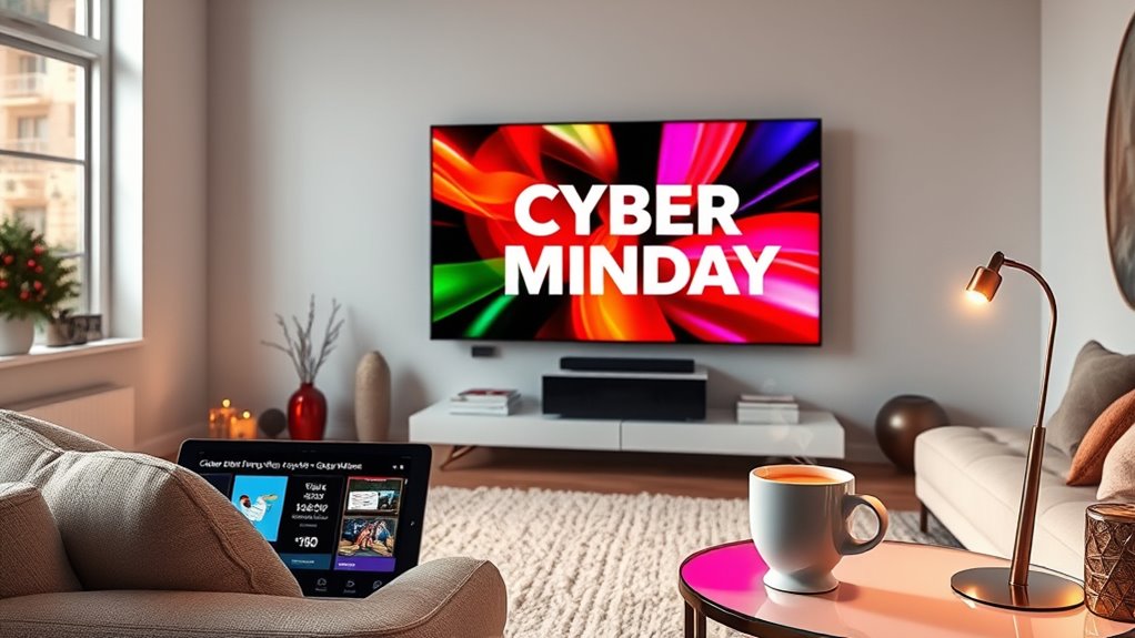 Choosing the right screen size for your OLED TV can considerably enhance your viewing experience, especially on Cyber Monday. I always consider the size of my viewing space first. If you have a spacious room, a larger screen—like 65 inches or more—can create that cinematic feel. For mid-sized or compact areas, a 55-inch model works perfectly. Remember, the ideal viewing distance is about 1.5 to 2.5 times the TV’s diagonal size. A screen that’s too large can strain your eyes, while one that’s too small might not deliver the visual impact you’re after. Additionally, think about the resolution and pixel pitch to ensure you get sharp, detailed images at your preferred distance. Happy shopping!