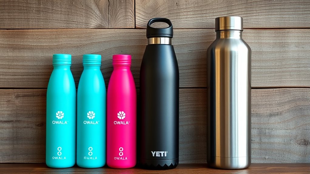 When I consider portability and convenience in water bottles, Owala and Yeti each bring unique strengths to the table. Owala bottles are designed for active lifestyles, featuring one-handed operation with flip or push-button lids, making it easy to hydrate on the go. Their range of sizes ensures I can find the perfect fit for any activity. On the other hand, Yeti bottles emphasize durability and leakproof transport, thanks to their secure twist or screw caps. While both brands include handy carry loops and cup-holder-friendly bases, I appreciate Owala’s focus on quick access and ease of use. Ultimately, my choice might depend on whether I prioritize convenience or rugged spill resistance for my adventures.