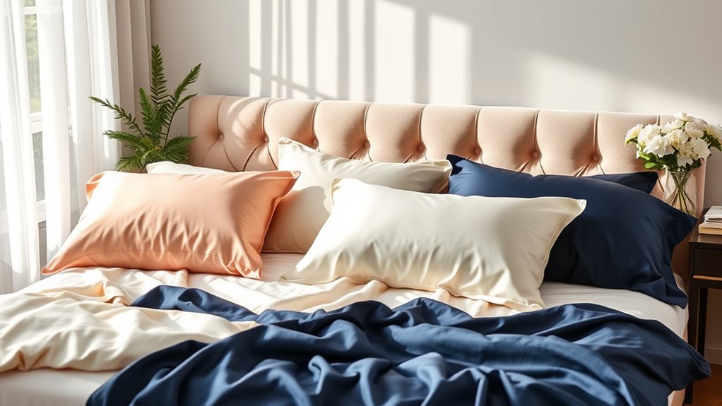If you want healthier hair and glowing skin, investing in the best silk pillowcases is a must. I love how these luxurious fabrics reduce friction, helping to minimize hair frizz and skin wrinkles. Look for high-quality mulberry silk models with secure closures to guarantee a snug fit. Plus, they help regulate temperature for a more comfortable sleep. If you’re curious about my top five picks and what to take into account when choosing, keep on discovering more!