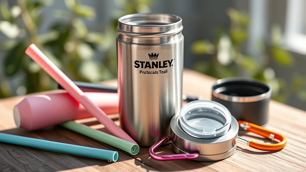 While it’s easy to get caught up in the aesthetics of Stanley tumbler accessories, I always prioritize material quality and safety. I make sure to choose accessories made from BPA-free and food-grade materials, ensuring they’re safe for daily use. Durable silicone or stainless steel components are a must for me, as they prevent breakage and ensure longevity. I also check that the materials are odorless and won’t leach harmful chemicals, keeping my beverages pure. It’s essential that the accessories are dishwasher safe and heat resistant for easy cleaning and added safety. Lastly, I look for non-slip and impact-absorbing materials to protect my tumbler and enhance user safety. It’s all about smart choices!